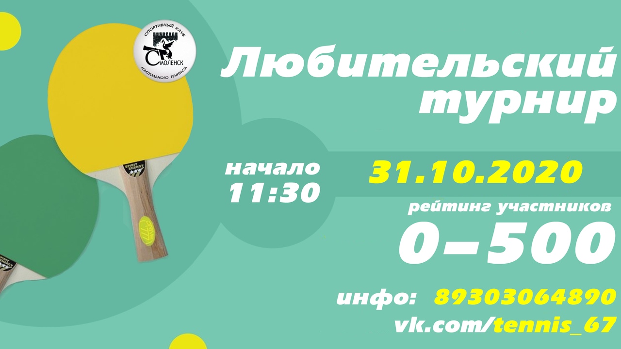 31 октября 2020 г. в клубе настольного тенниса "Смоленск" по адресу Трамвайный проезд д. 8 состоится любительский турнир с ограничением рейтинга до 500 очков.Начало регистрации в 11.00