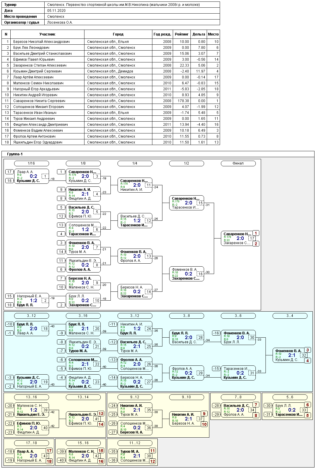 1. Первое место - Мартынова Марина (г.Вязьма) 2. Второе место - Тищенкова Маргарита (г.Смоленск) 3. Третье место - Казакова Александра (г.Смоленск) Полные результаты здесь Девушки 2005 г.р. и моложе: 1. Первое место - Казакова Александра (г.Смоленск) 2. Второе место - Павлова Ольга (г.Смоленск) 3. Третье место - Байрамова Камилла (г.Смоленск) Девушки 2002 г.р. и моложе: 1. Первое место - Казакова Александра (г.Смоленск) 2. Второе место - Павлова Ольга (г.Смоленск) 3. Третье место - Байрамова Камилла (г.Смоленск) Полные результаты здесь | Юноши 2008 г.р. и моложе:
