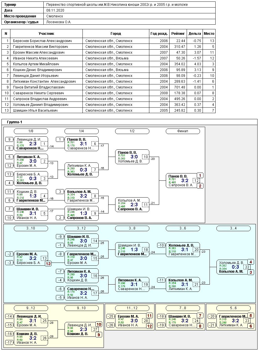 1. Первое место - Саваренков Никита (г.Смоленск) 2. Второе место - Захаренков Степан (г.Смоленск) 3. Третье место - Фоменков Вадим (г.Смоленск) Полные результаты здесь Юноши 2005 г.р. и моложе: 1. Первое место - Шамшин Илья (г.Смоленск) 2. Второе место - Саваренков Никита (г.Смоленск) 3. Третье место - Кошкин Денис (г.Смоленск) Юноши 2002 г.р. и моложе: 1. Первое место - Панов Виталий (г.Смоленск) 2. Второе место - Сапронов Владислав (г.Смоленск) 3. Третье место - Копылов Артём (г.Смоленск) Полные результаты здесь |