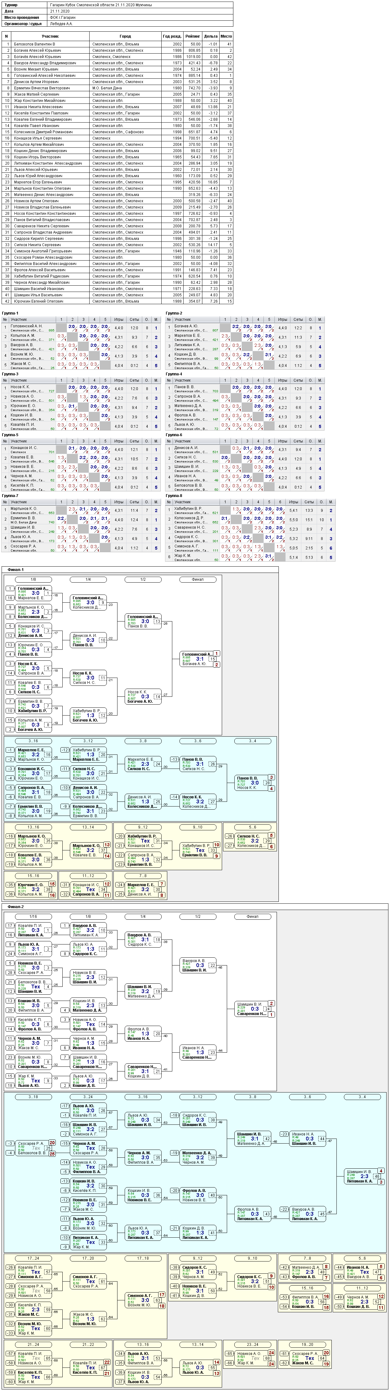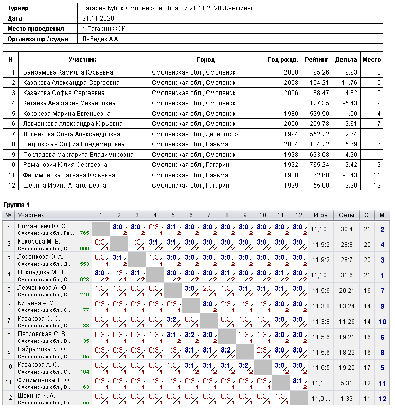 21-22 ноября 2020 г. в г. Гагарин состоялся Кубок Смоленской области.В одном из самых важных стартов сезона приняли участие 54 человека из Вязьмы, Гагарина, Ершичи, Сафоново, Смоленска. Соревнования прошли в дружественной, гостеприимной обстановке. Федерация настольного тенниса Смоленской области выражает благодарность Администрации МО "Гагаринский район" и лично вице-президенту ФНТСО Хабибулину Виталию Радиковичу за организацию и проведение соревнований на высоком уровне, а также судейской коллегии во главе с Лебедевым Андреем Александровичем.