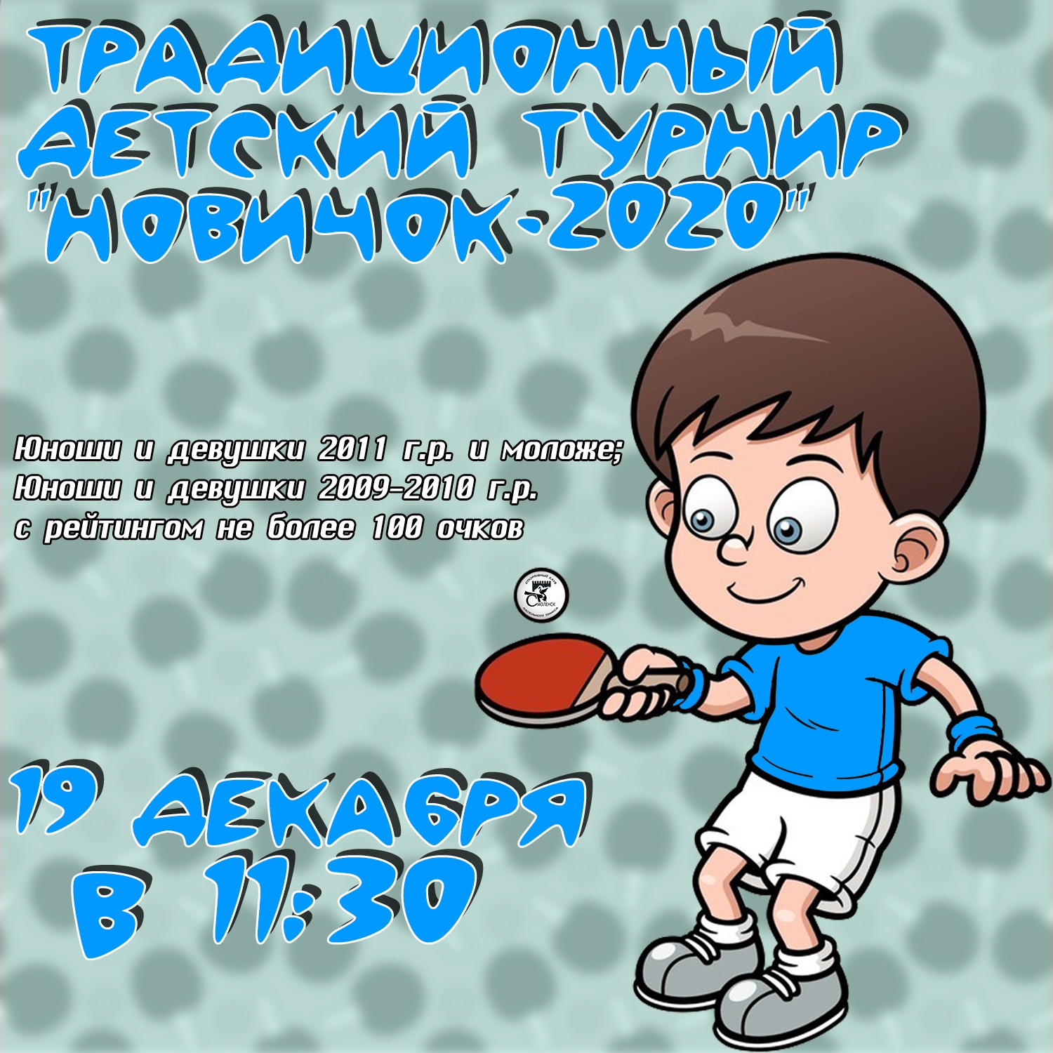 19 декабря 2020 г. в клубе настольного тенниса "Смоленск" состоится традиционный турнир "Новичок 2020".Адрес: Трамвайный проезд д.8, 3 этаж, вход через кафе "Кливия".