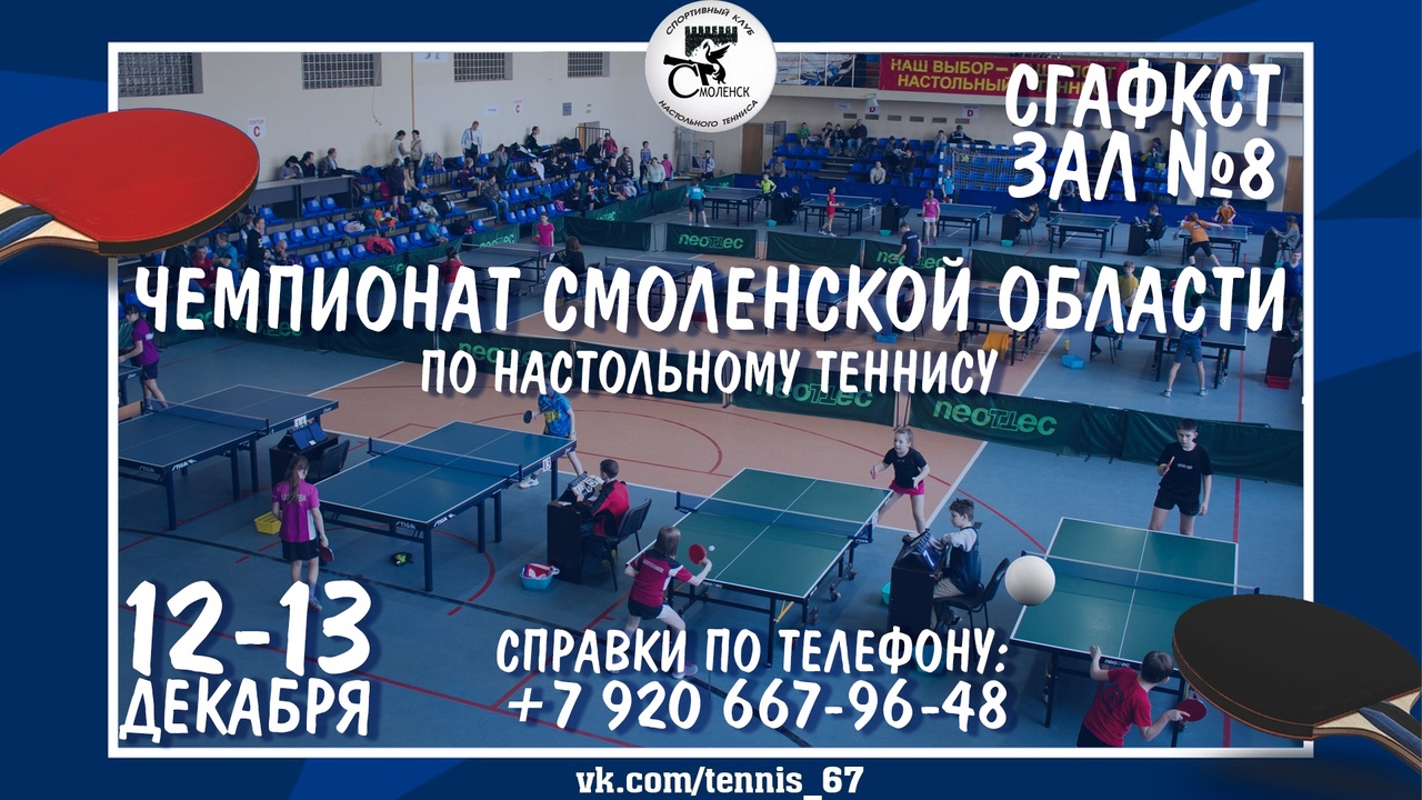 Чемпионат Смоленской области состоятся 12-13 декабря 2020 г. в спортивном зале №8 СГАФКСТ по адресу: г.Смоленск, пр.Гагарина. Для участия открыта предварительная регистрация на сайте http://tennis67.ru/registration/list6.php до 10 декабря 2020 г. до 21.00