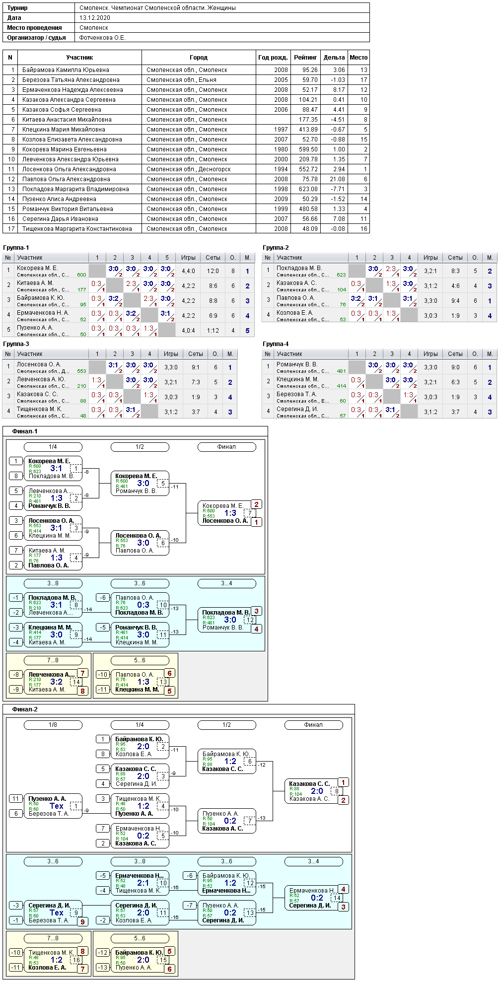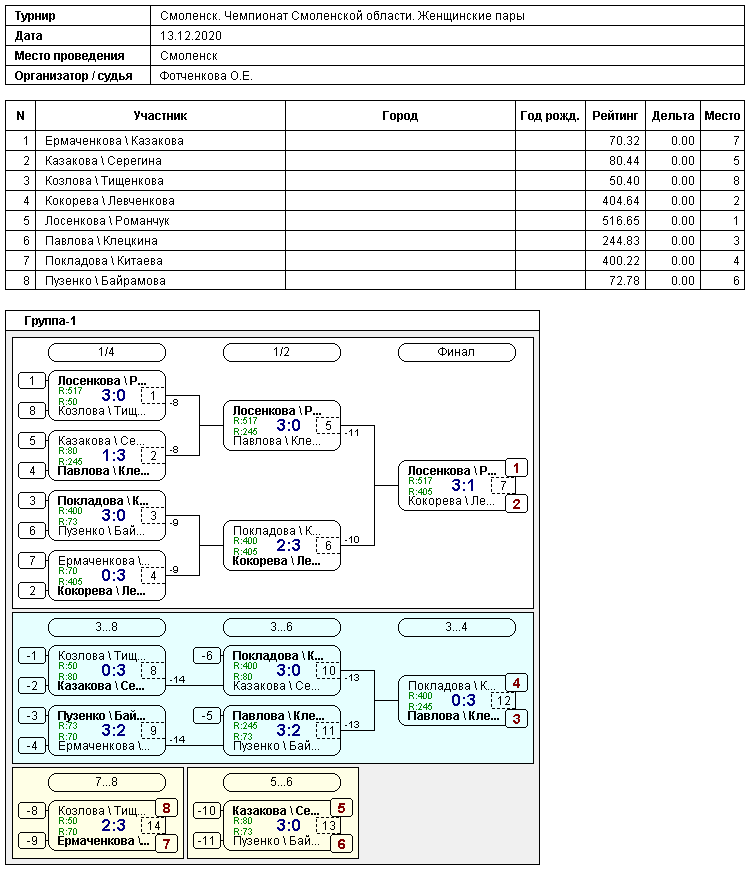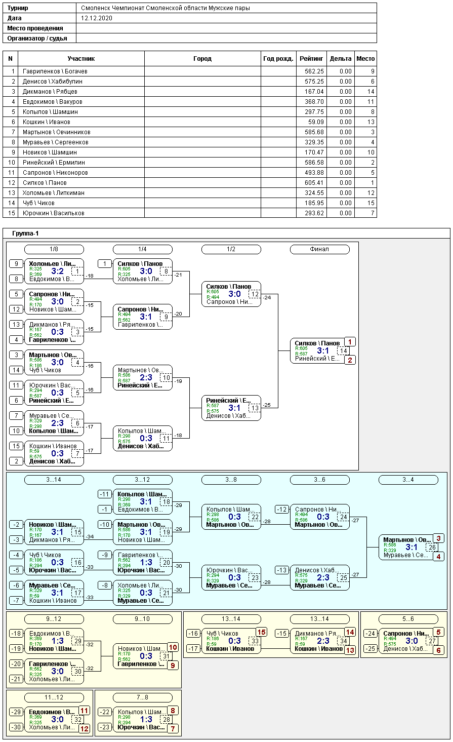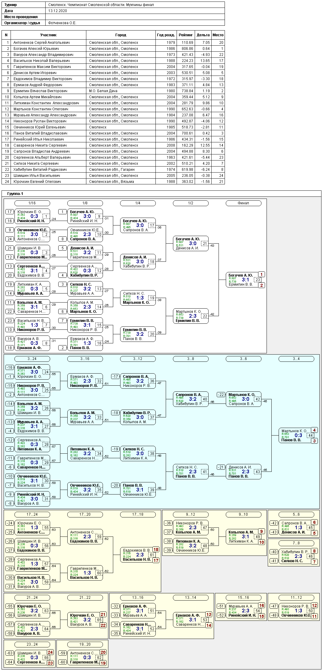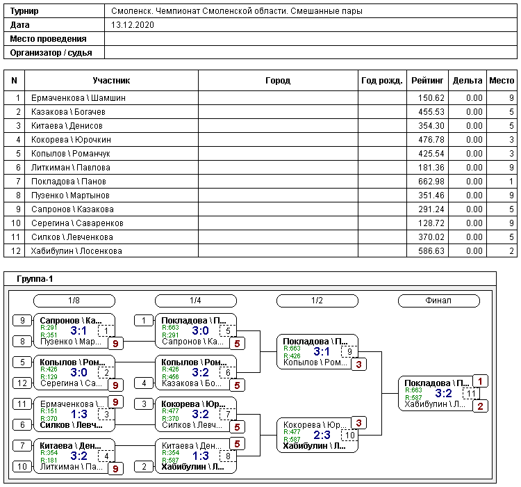 1 место Богачев Алексей - г. Смоленск 2 место Ермилин Вячеслав - г. Смоленск 3 место Панов Виталий - г. Смоленск Результаты группового этапа здесь Результаты финала здесь Результаты второго финала здесь Женщины: 1 место Лосенкова Ольга - г. Смоленск 2 место Кокорева Марина - г. Смоленск 3 место Покладова Маргарита - г. Смоленск Результаты женского турнира здесь Смешанные пары: 1 место Панов Виталий - Покладова Маргарита 2 место Лосенкова Ольга - Хабибулин Виталий 3 место Юрочкин Евгений - Кокорева Марина Результаты смешанных пар здесь | Мужские пары: