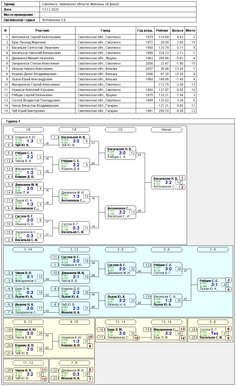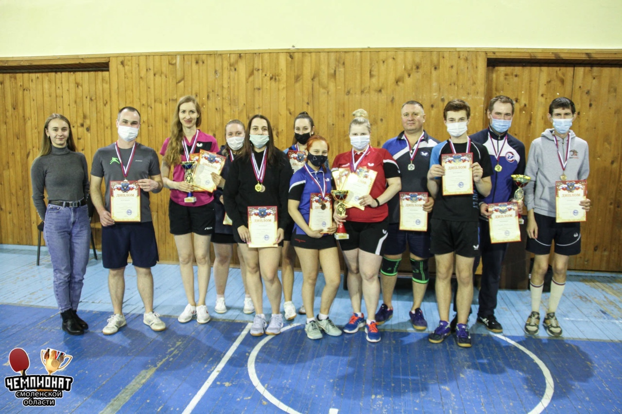 12-13 декабря 2020 г. в Смоленске в спортивном зале СГАФСТ состоялся Чемпионат Смоленской области по настольному теннису.В турнире приняли участие 60 человек из Вязьмы, Гагарига, Ельни, Сафонова, Смоленска, Ярцева.