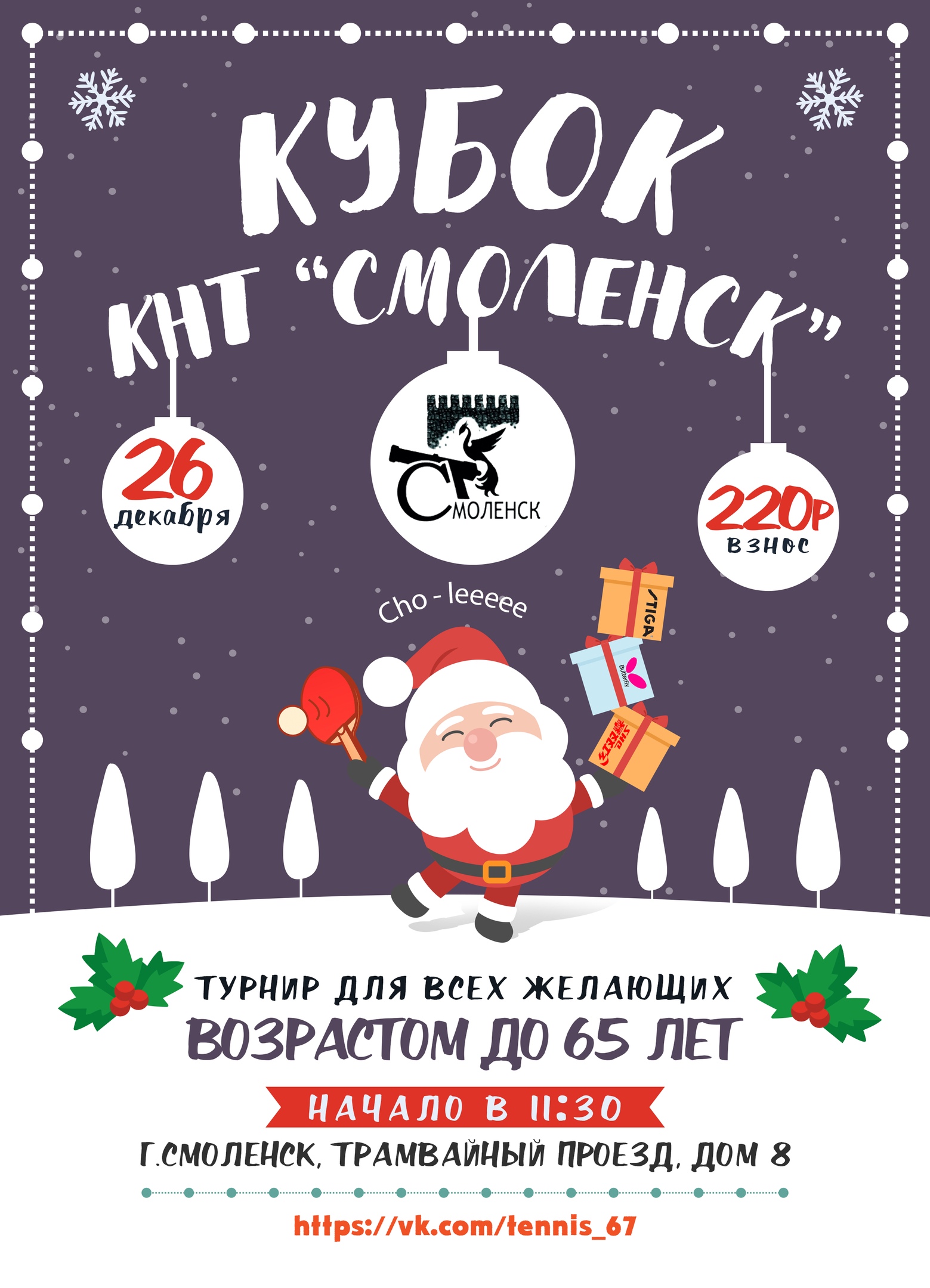 26 декабря 2020 года состоится турнир по настольному теннису Кубок КНТ "Смоленск" по адресу: Трамвайный проезд, д.8, 3 этаж.Начало в 11.30 Регистрация участников с 11.00 до 11.25