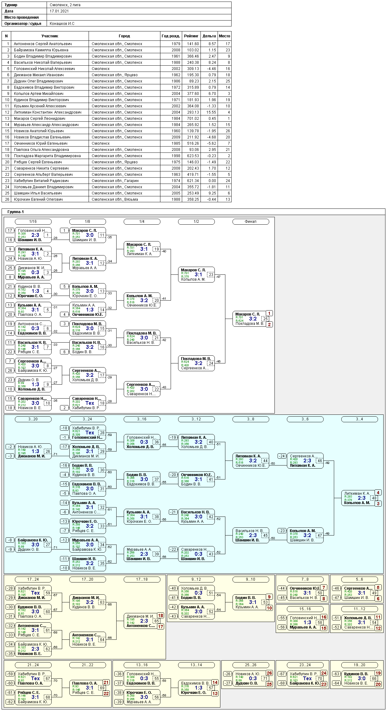 Победители и призеры были награждены грамотами и ценными призами. Турнир будет обсчитан областным рейтингом и рейтингом ТТВ. Участники, занявшие с 1 по 5 место проходят в 1 лигу, которая состоится 7 февраля.