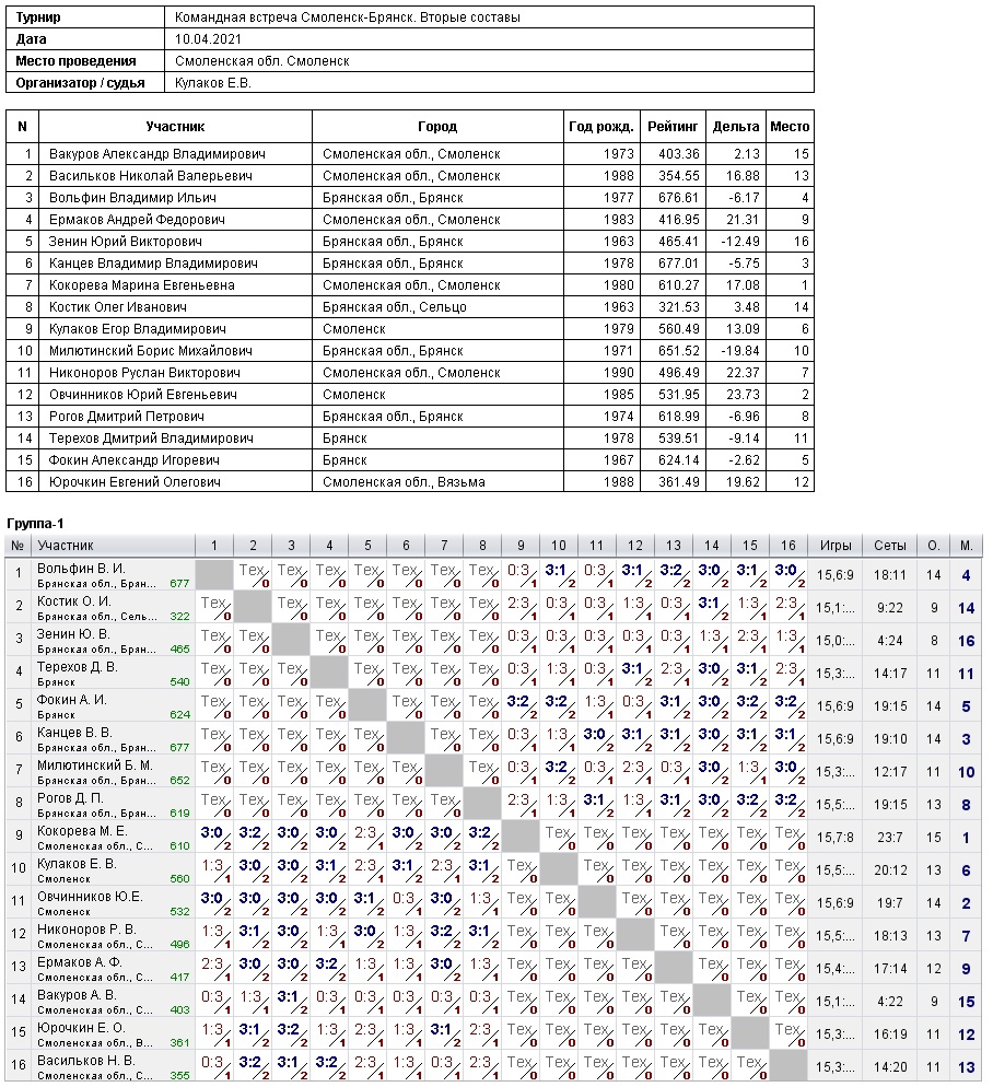 10 апреля 2021 г. состоялась ответная встреча вторых составов г.Смоленска и г.Брянска. Соревнования проходили на базе СОШ №16. На своей земле наши ребята победили! Молодцы! Федерация настольного тенниса Смоленской области выражает благодарность Кулакову Егору за предоставление площадки для проведения встречи и всем участникам команд г.Смоленска и г.Брянска за их активную позицию и постоянное движение вперед в спорте!