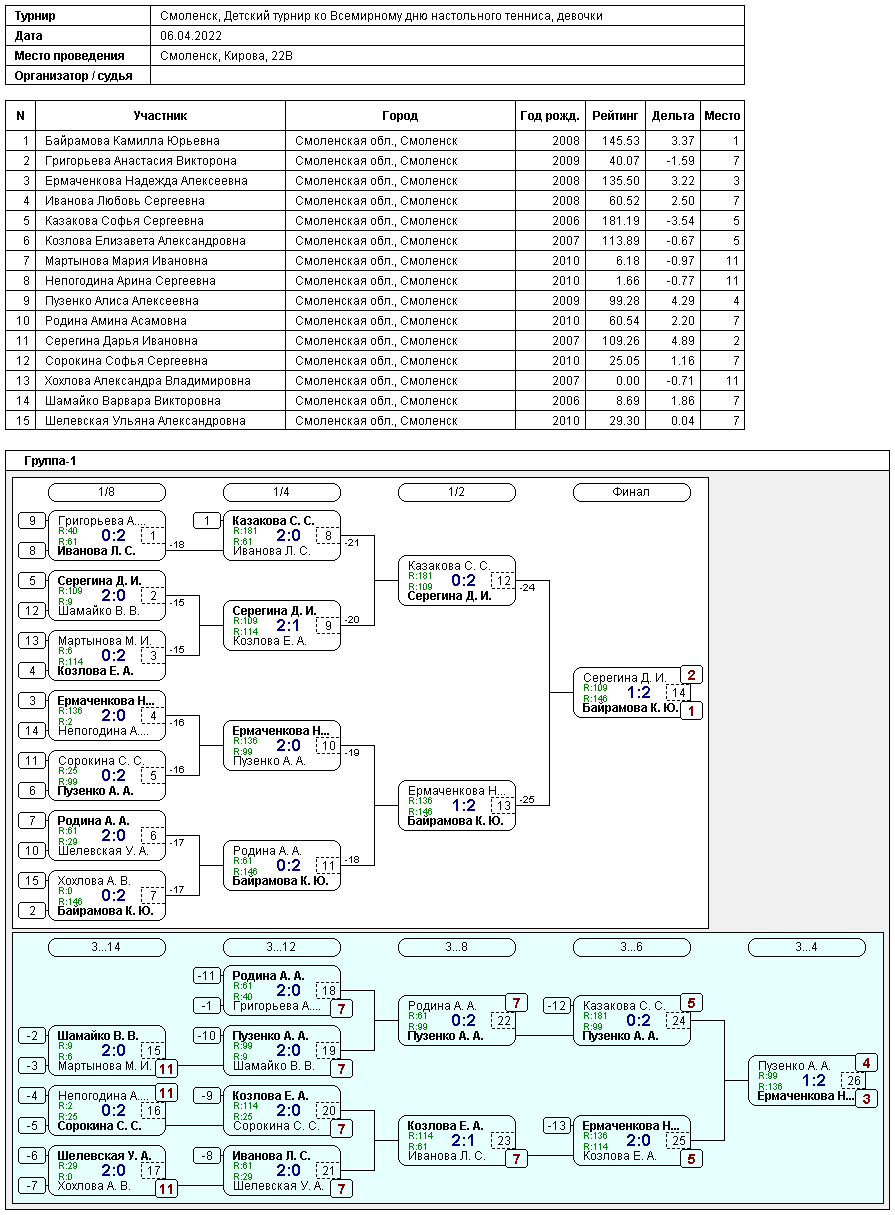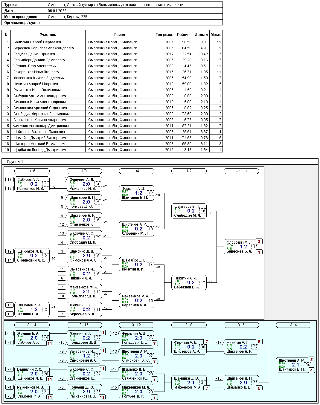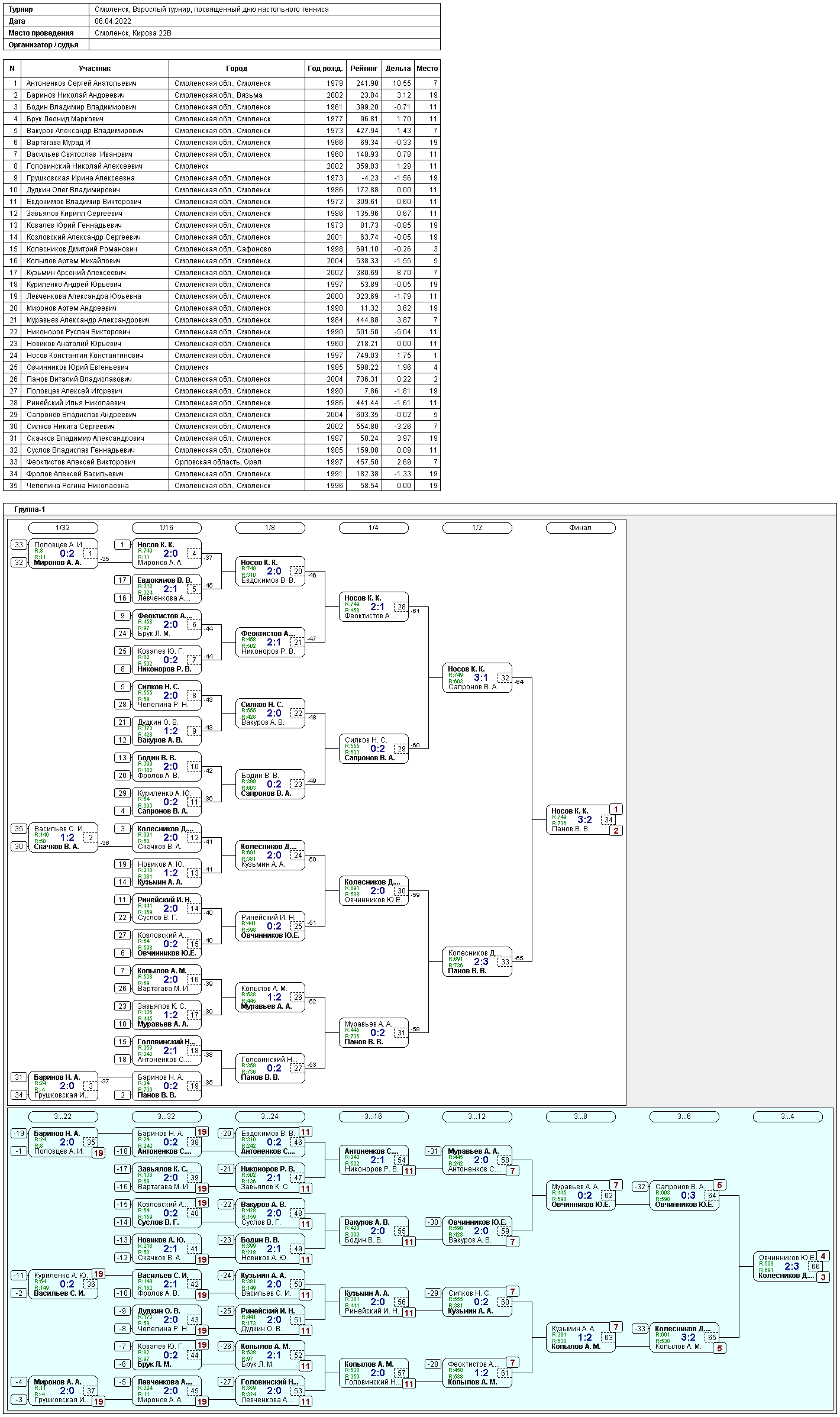 6 апреля 2022 г. в КНТ "Смоленск" по адресу: г.Смоленск, ул.Кирова, д.22б прошел Фестиваль настольного тенниса, посвященный всемирному дню настольного тенниса. В соревнованиях приняли участие 34 юноши и девушки и 35 взрослых.