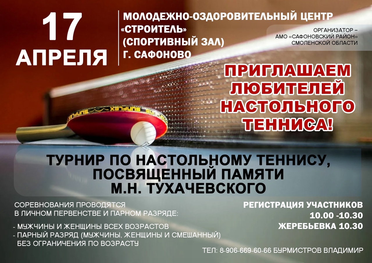 17 и 23 апреля 2022 г. в г.Сафоново состоится традиционный турнир памяти М.Н.Тухачевского. Обращаем ваше внимание, что 17 апреля (воскресенье) 2022 г. состоятся соревнования среди мужчин и женщин, а 23 апреля (суббота) среди юношей, девушек и ветеранов.