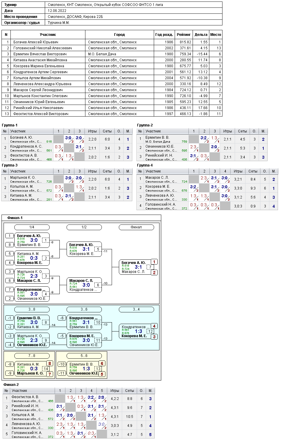 Долгожданные результаты лиг!12 июня 2022 г. в КНТ "Смоленск" состоялись очередные этапы Кубка СОФСОО ФНТСО 1 и 3 лига. В соревнованиях приняли участие 36 спортсменов из Вязьмы, Гагарина, Сафоново, Рославля, Москвы, Смоленска.
