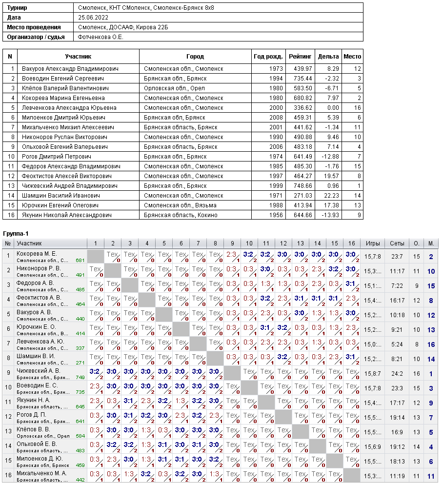 Андрей Чижевский без труда одержал победу над 7 игроками, в 8 встрече против Марины Кокоревой пришлось попотеть и понервничать, как итог 3:2 одержал победу, в результате заслуженное 1 место в личном зачёте.