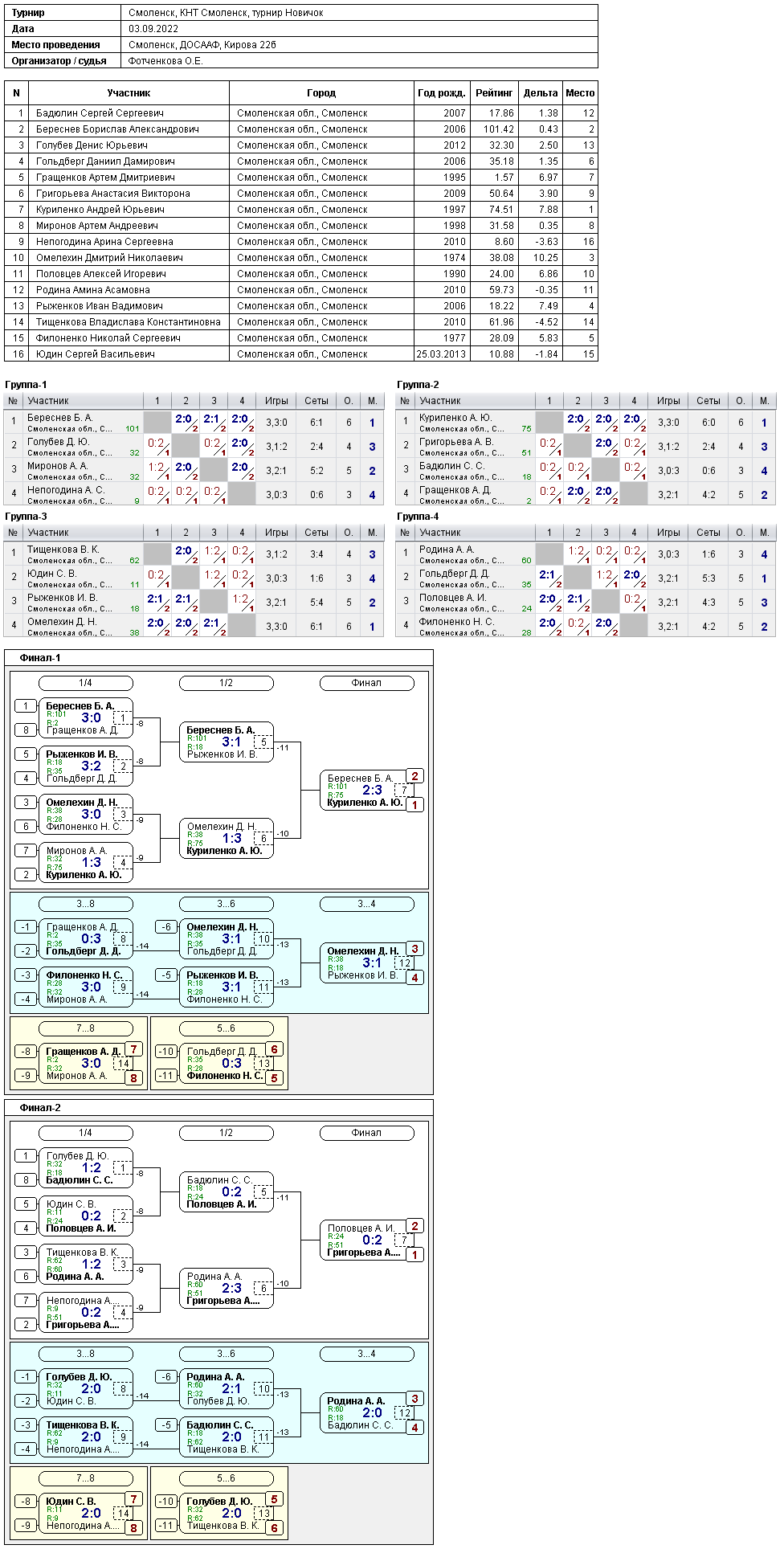 3 сентября 2022 г. в КНТ "Смоленск" состоялся турнир для спортсменов начального уровня "Новичок". В турнире приняли участие 16 спортсменов.Призерами стали: