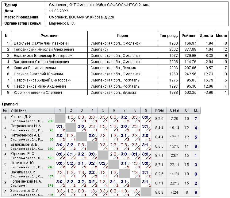11 сентября 2022 г. в КНТ " Смоленск " состоялся 3 этап Кубка СОФСОО ФНТСО (2 лига). В соревнованиях приняли участие 9 спортсменов из Смоленска и Рославля. Для выявления сильнейшего игры проводились по круговой системе.Призерами стали: