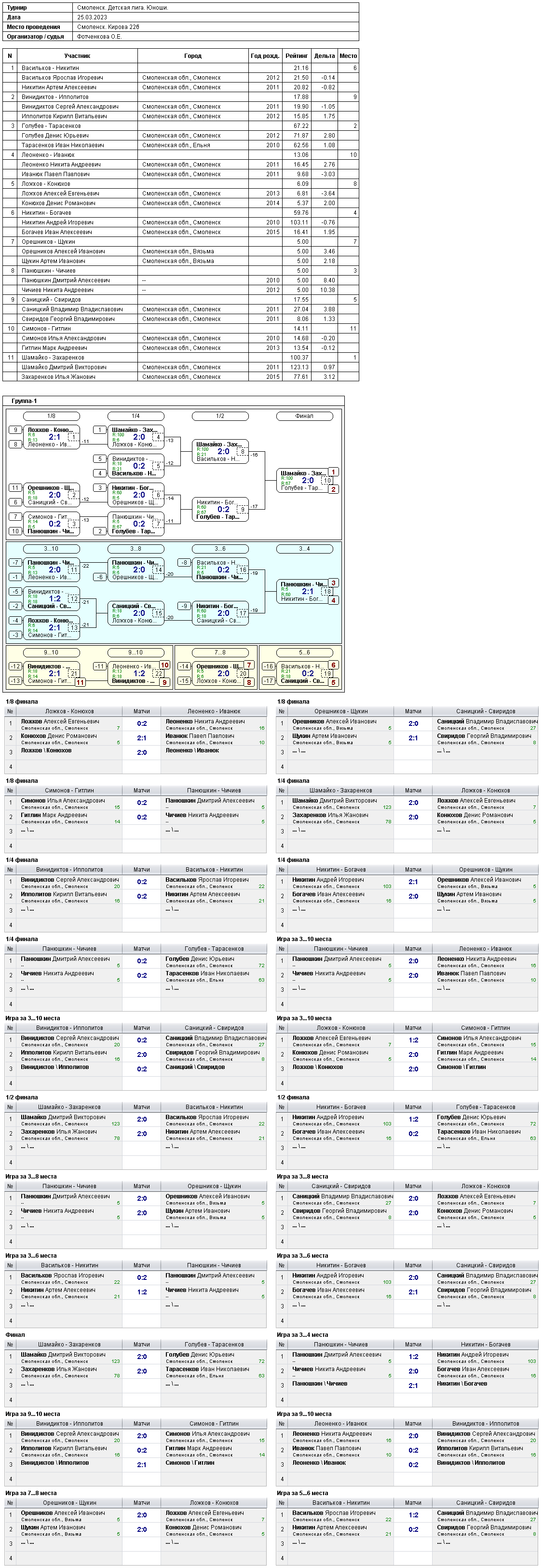 26 марта 2023 года в КНТ "Смоленск" состоялся командный турнир "Детская лига" среди юношей и девушек 2010 г.р. и моложе.В турнире приняли участие 35 спортсменов из Смоленска, Ельни, Вязьмы и Брянска.