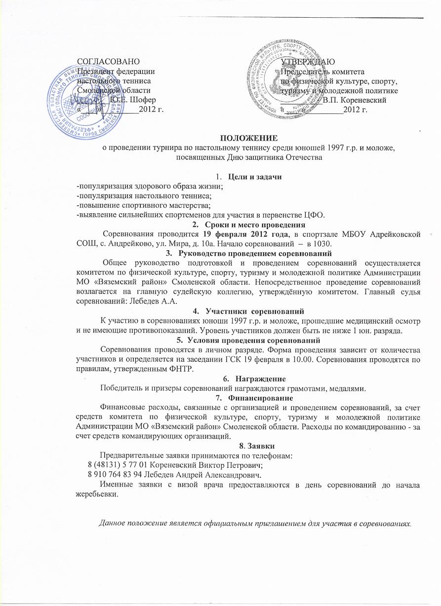 19 февраля в г. Вязьма будет проходить турнир посвященный Дню защитника Отечества. Турнир является отборочным этапом для юношей 1997 года рождения. Участник, занявший 1 место на турнире попадает в команду Смоленской области по настольному теннису для участия в Первенстве ЦФО в г.Рыбинск Ярославской области с 12 по 16 марта 2012 г. Еще одно место в команде отдается спортсмену, занявшему со 2 по 4 место в турнире - решением тренерского совета.Положение о соревнованиях можно скачать здесь